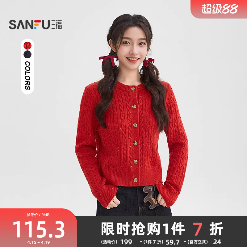 三福红色开衫2026新款春季彩点纱圆领宽松披肩毛衣上衣女装516026