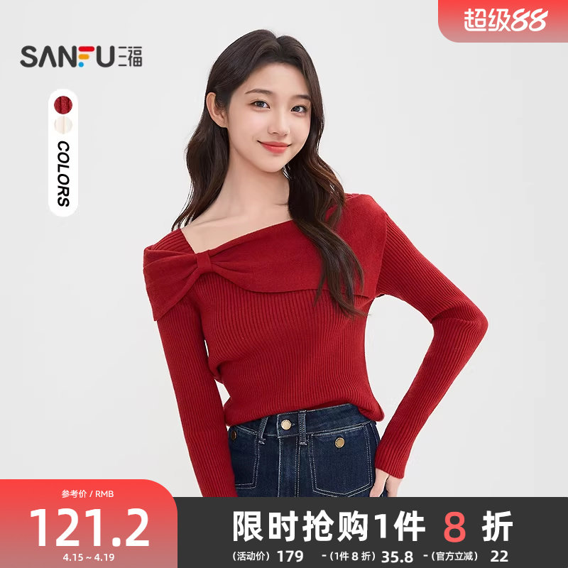 三福红色毛衣女2026新款春季气质优雅方领本命年针织衫女装516789