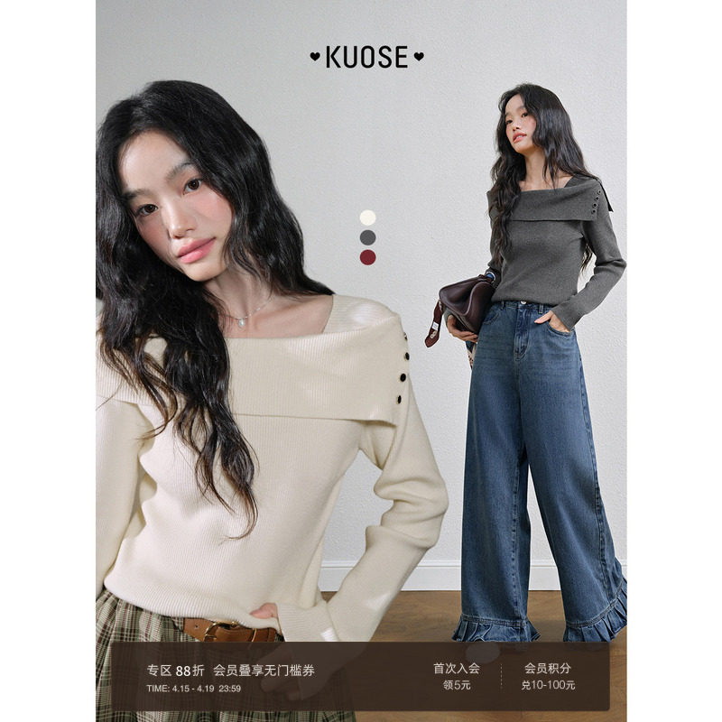 阔色杏色一字肩修身针织衫女26春季红色内搭打底毛衣露肩上衣秋冬