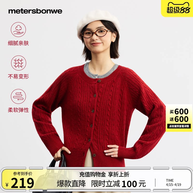 美特斯邦威毛衣女2026春季新款新年红色毛织舒适休闲圆领绞花开衫