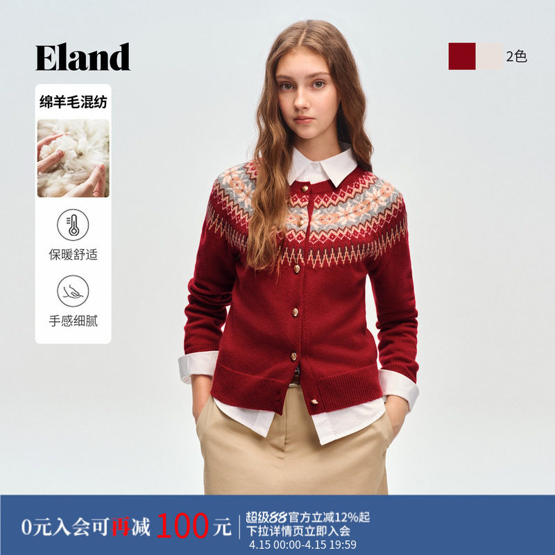 Eland衣恋毛针织衫女费尔岛提花红色针织衫毛衣2026春季新款