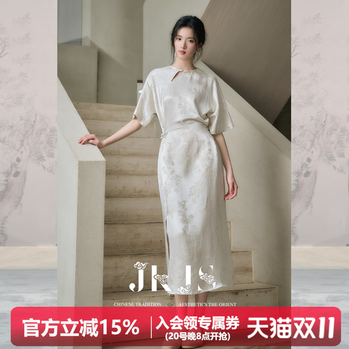 JKJS【流云玉】人丝亚麻 新中式连衣裙露肩绣花白色长裙里布天丝