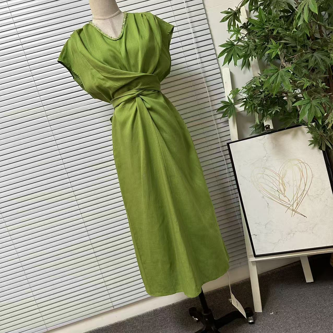 0925-1法系高级感时尚轻奢天丝亚麻V领连衣裙绑带扭结收腰长裙