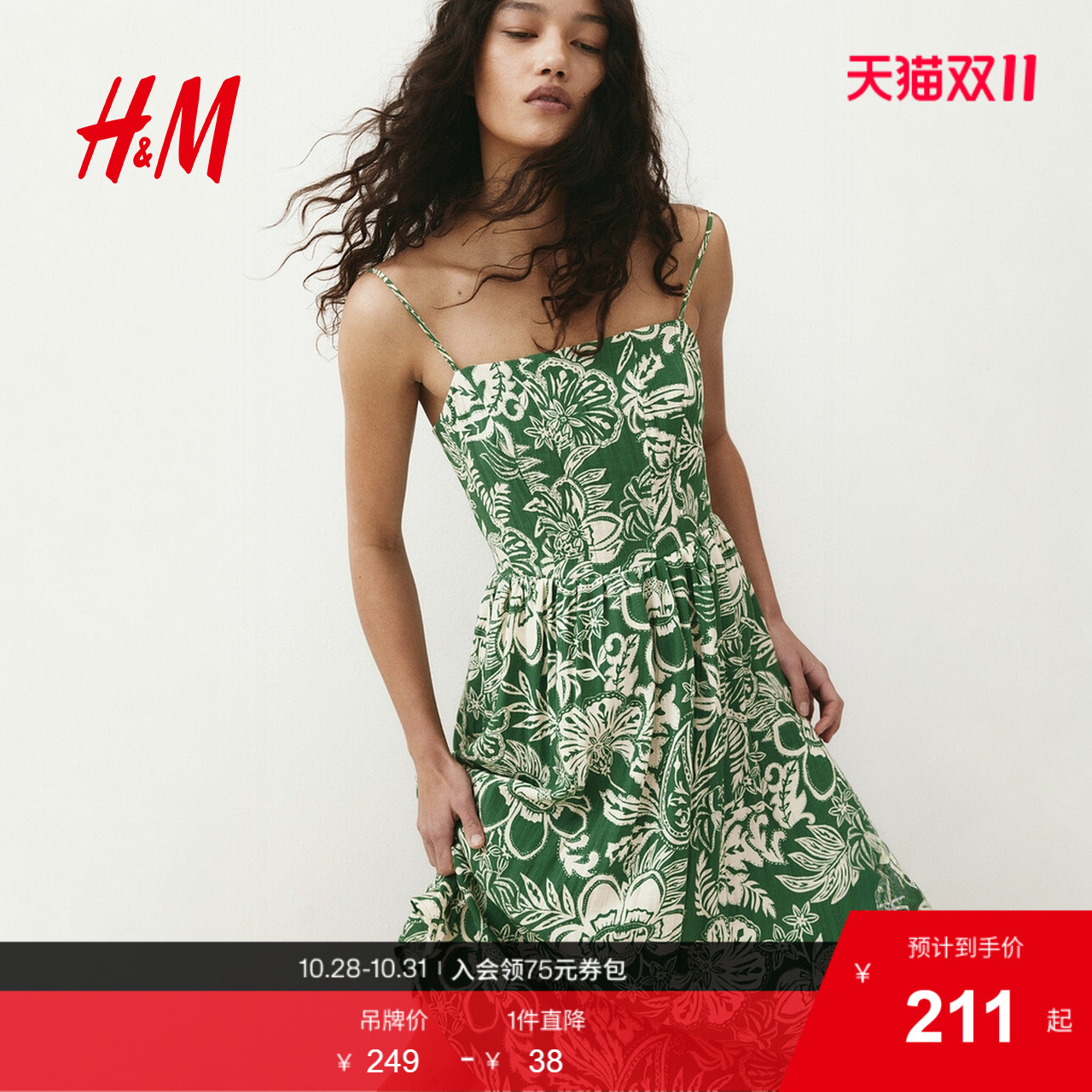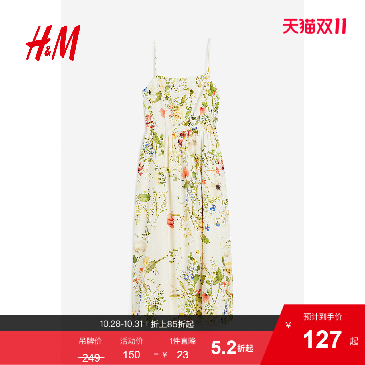 HM女装连衣裙秋度假风印花吊带修身亚麻混纺植物印花长裙1217048
