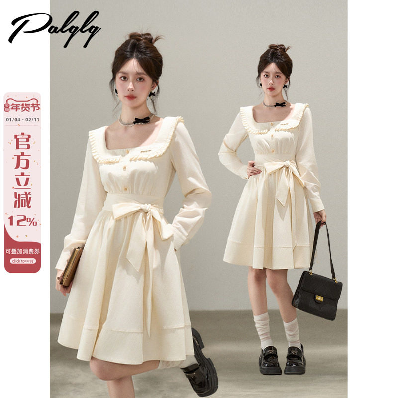 甜美学院风杏色方领长袖连衣裙女秋季高级感法式收腰大摆中长款裙