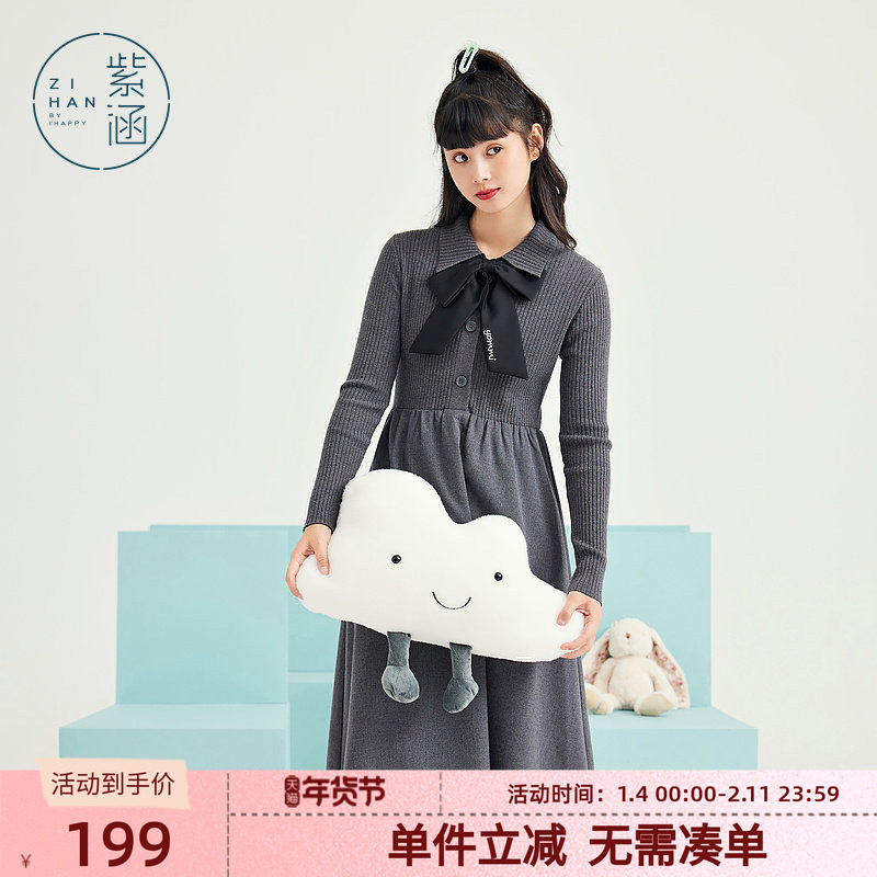 紫涵毛织拼接长款连衣裙女冬季新款学院风绣花高收腰中长款a字裙