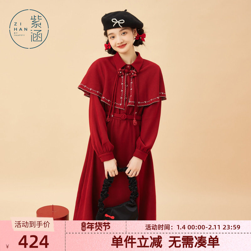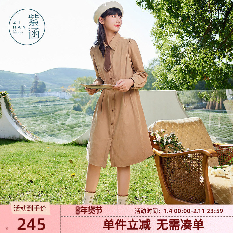 紫涵收腰中长款衬衫连衣裙女冬季新款简约学院风新国风披肩A字裙