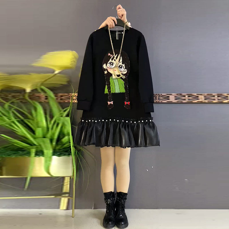 大码女装卡通女孩拼底摆连衣裙胖妹妹中长款韩版学院风显瘦淑女裙