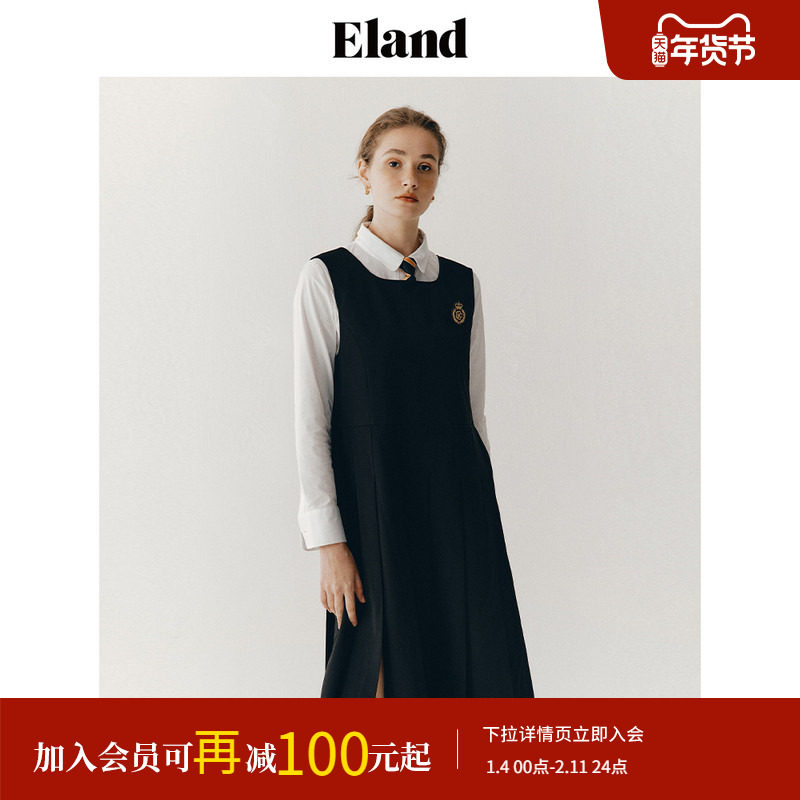 【Eland奥莱】衣恋连衣裙女中长款学院风方领无袖过膝裙子女秋冬