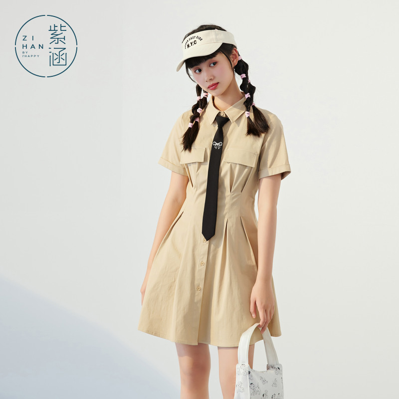 紫涵学院风衬衫连衣裙女夏季新款文艺森系时尚收腰翻领短袖中长裙