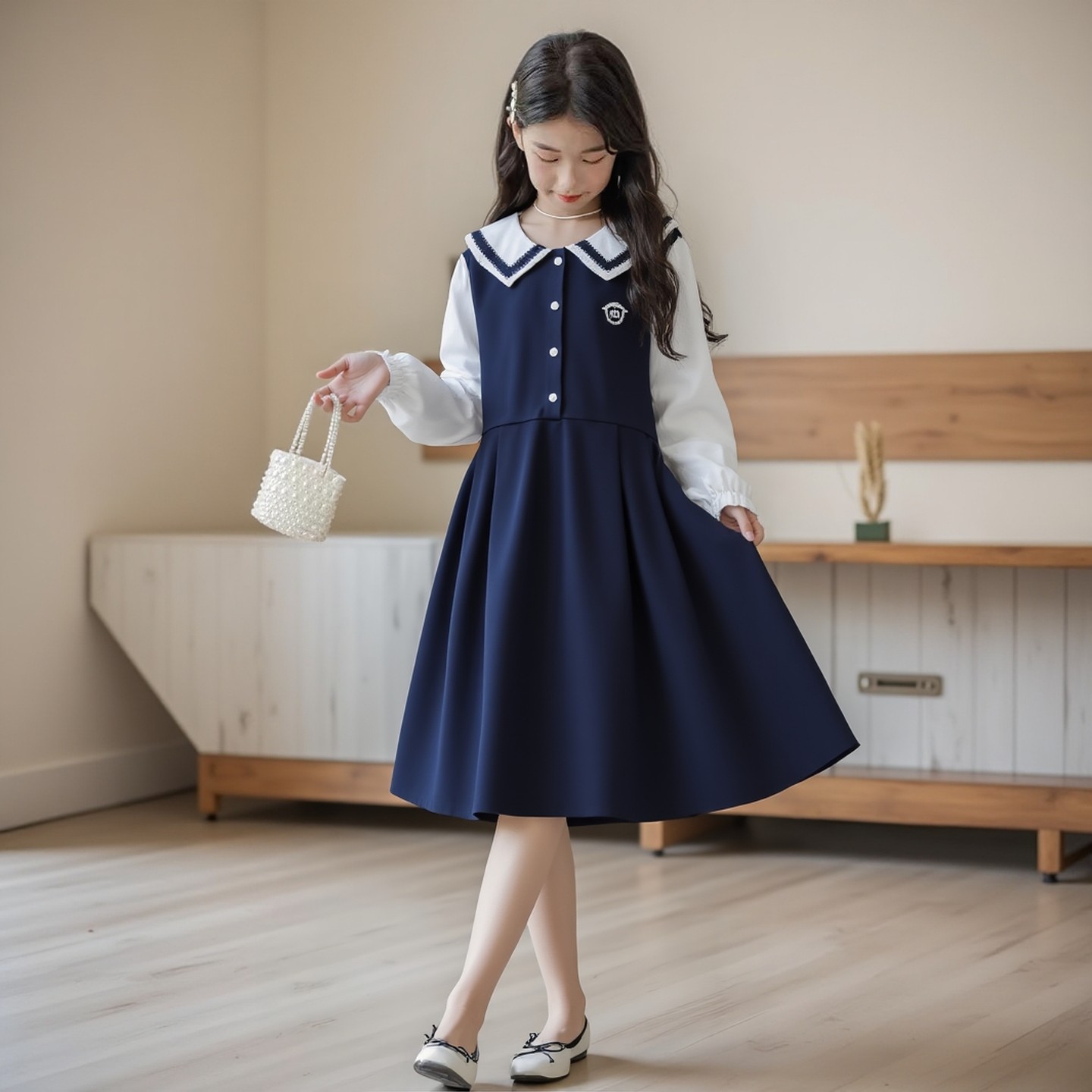 2026春季新款女童长袖假两件翻海军领学院风中长款连衣裙3-15岁