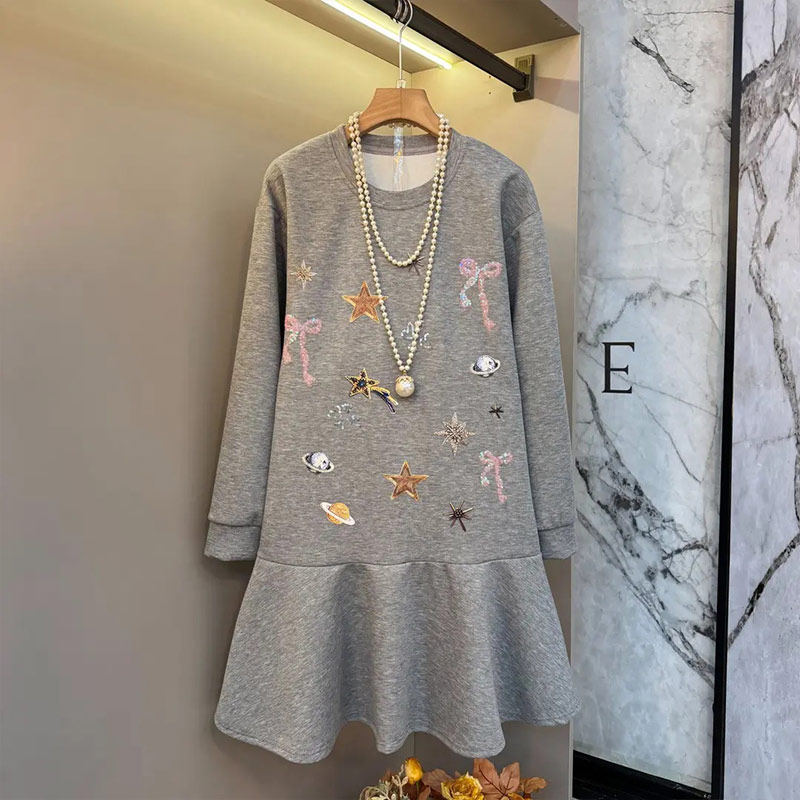 加肥女星星图案长袖连衣裙胖妹妹中长款学院风减龄韩版休闲卫衣裙