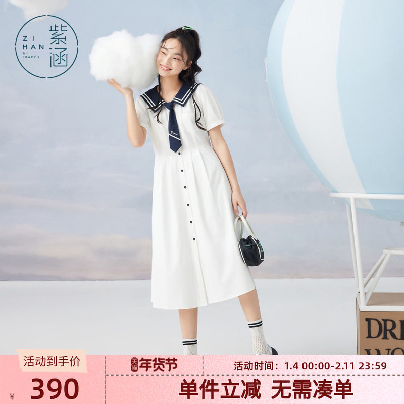 紫涵学院风海军领连衣裙女夏季新款日系休闲短袖宽松收腰中长裙子