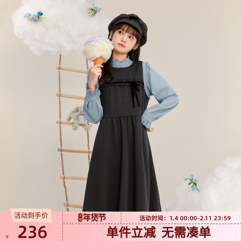 紫涵无袖背心连衣裙女冬季新款蝴蝶结甜美学院风叠穿中长款a字裙