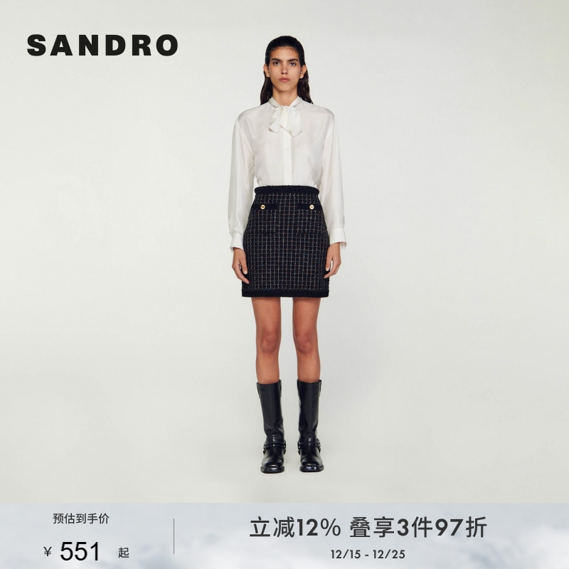 SANDROOutlets女装套装经典黑色气质细闪格纹针织开衫外套半身裙