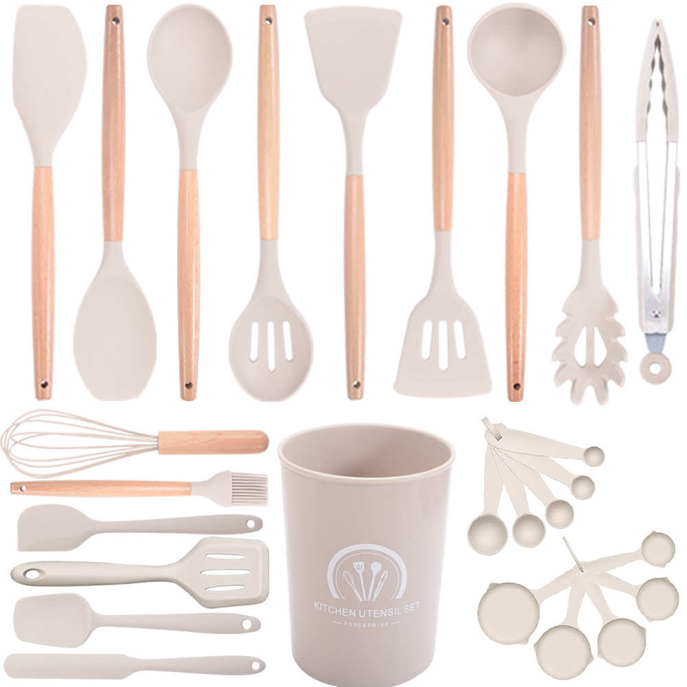 跨境现货35件i硅胶烹饪厨具套装耐热厨房小工具不粘锅勺铲木柄餐