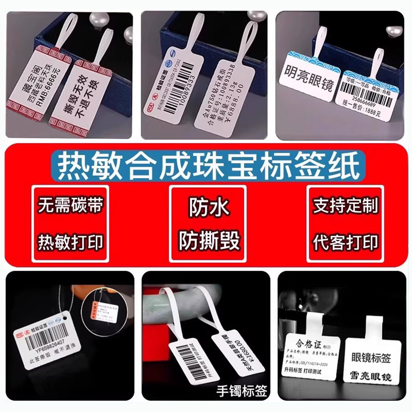 珠宝标签纸热敏首饰戒指吊牌价格贴纸翡翠吊牌手镯三防热敏不干胶打印定制眼镜价格签撕毁无效珠宝标签代打印