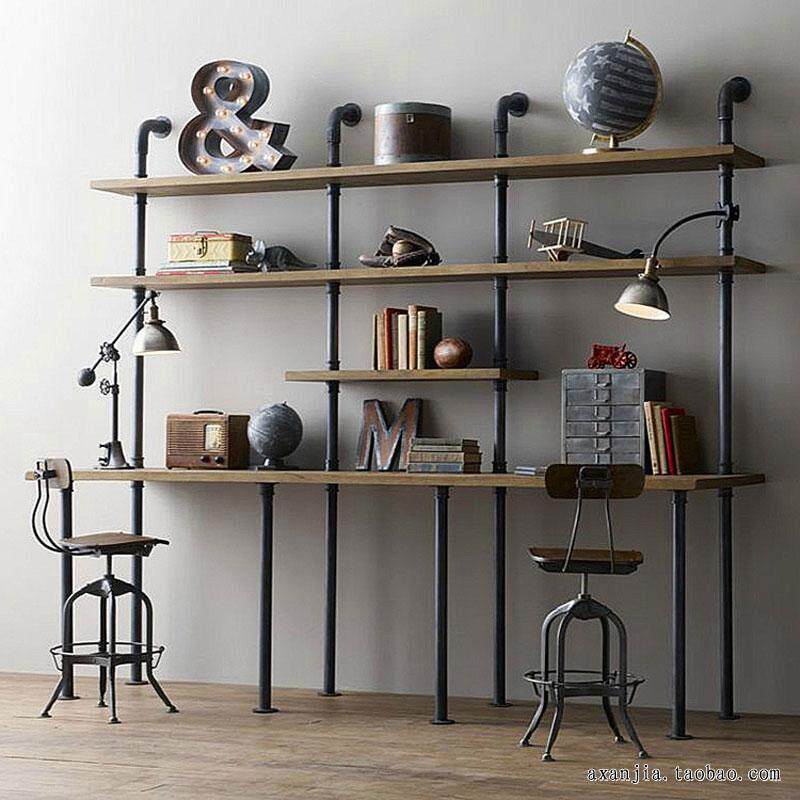 loft复古铁艺水管做旧实木书桌书架简约电脑桌置物展示架创意墙上