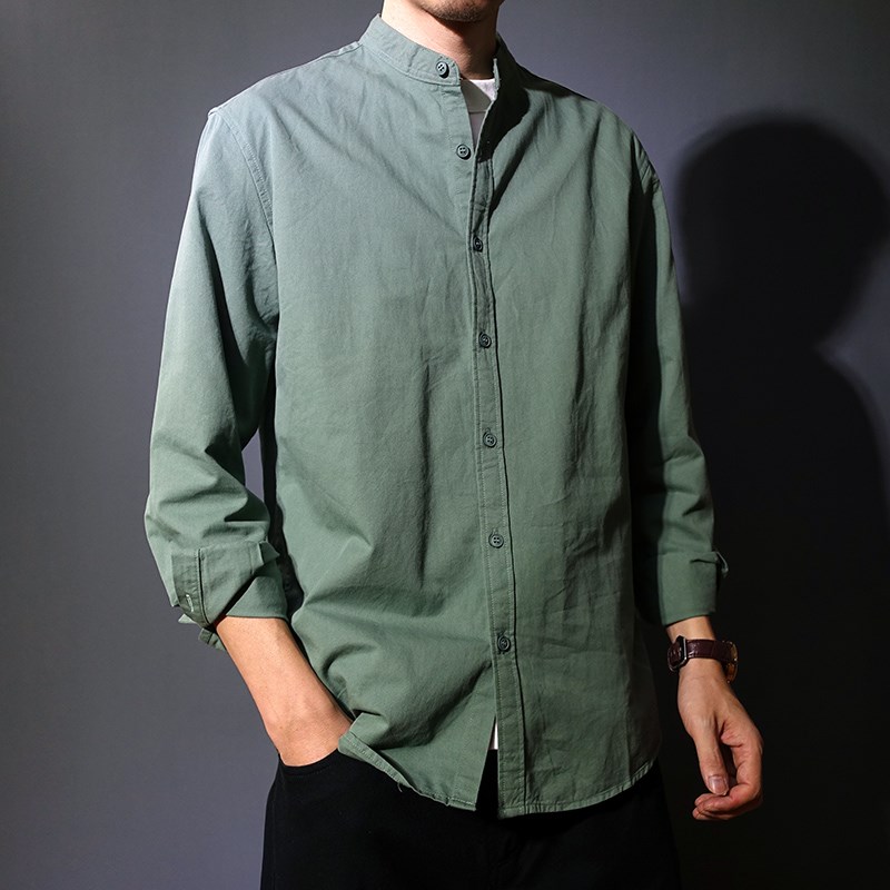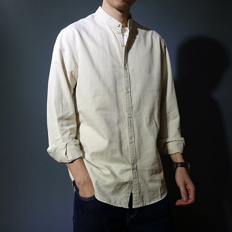 中国风纯棉立领复古长袖r衬衫男版中山装青年斜纹棉休闲纯色衬衣