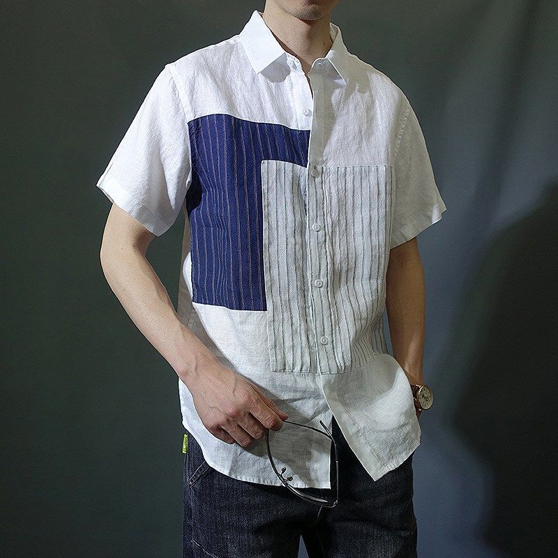 条纹拼接夏季短袖衬衫纯亚麻男版透气黑色白色休闲夏季宽松上衣潮