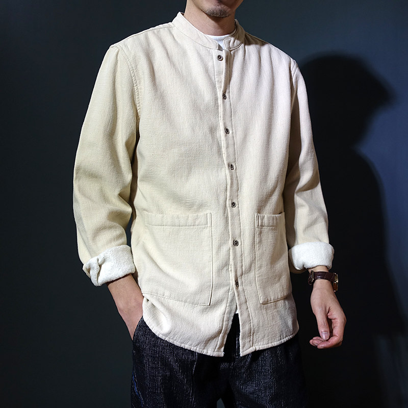 秋冬中国风加绒加厚立领长u袖衬衫保暖棉麻男版中山装苧麻中式衬