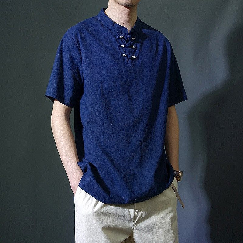唐装夏季中国风盘扣亚麻套头短袖衬衫立领薄款宽松透气中山装男版