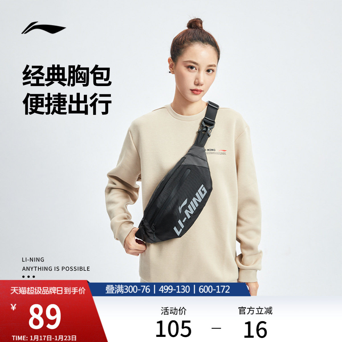 李宁腰包斜挎包男士女款轻便多功能胸包黑色时尚休闲运动单肩包包