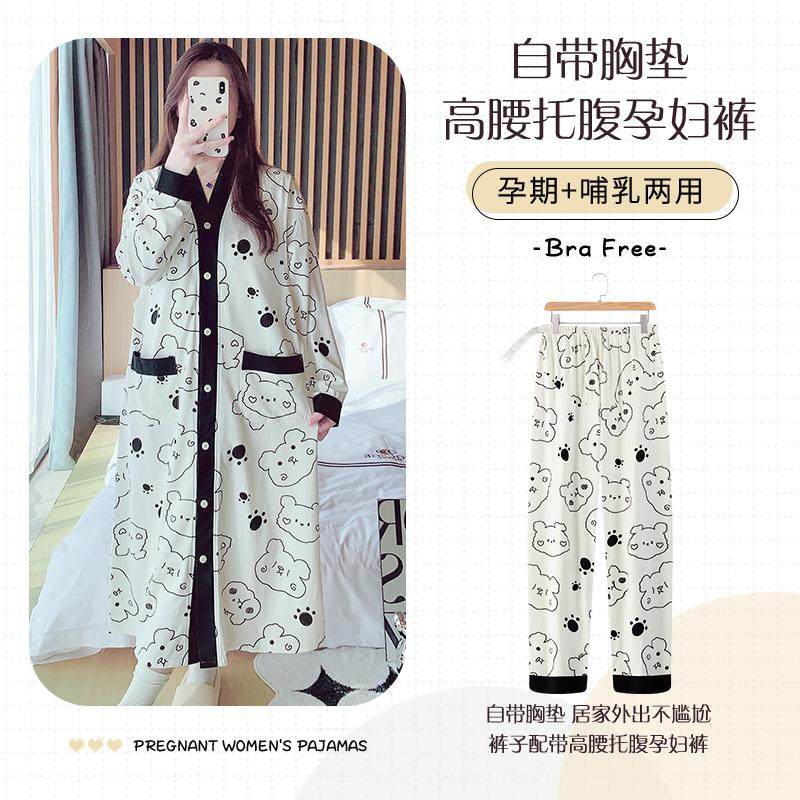 带胸垫春秋季夏薄款哺乳中长款连衣睡裙月子服孕妇高腰托腹裤纯棉