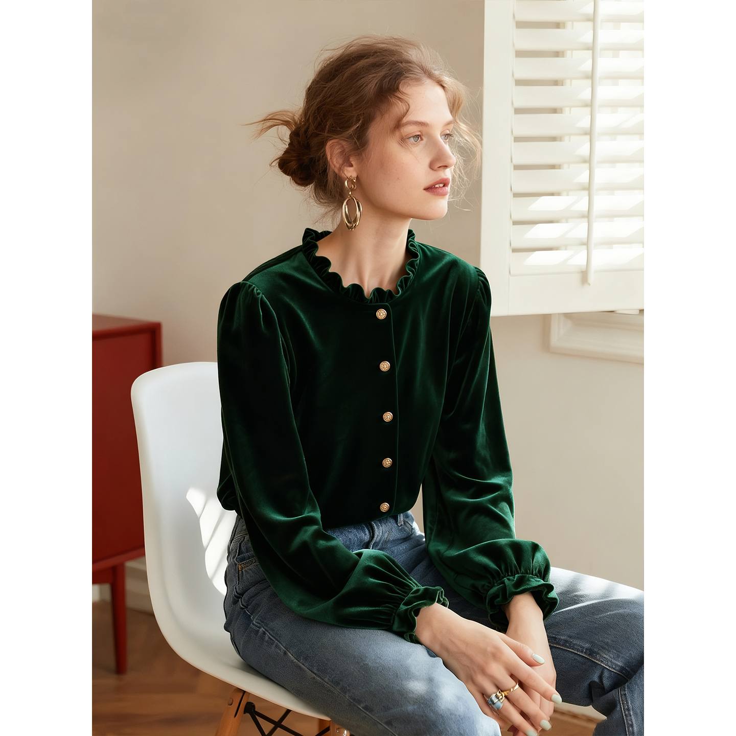 法式立领木耳边长袖丝绒衬衫女2025年秋冬新款珍珠扣复古气质上衣