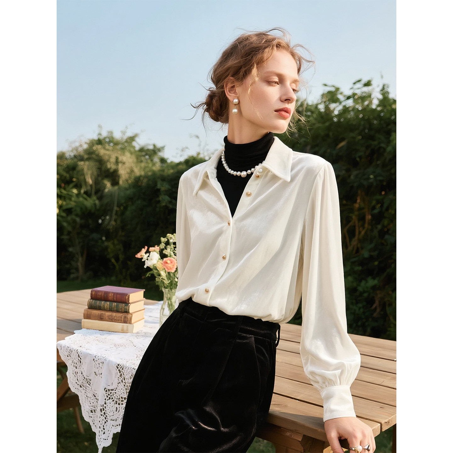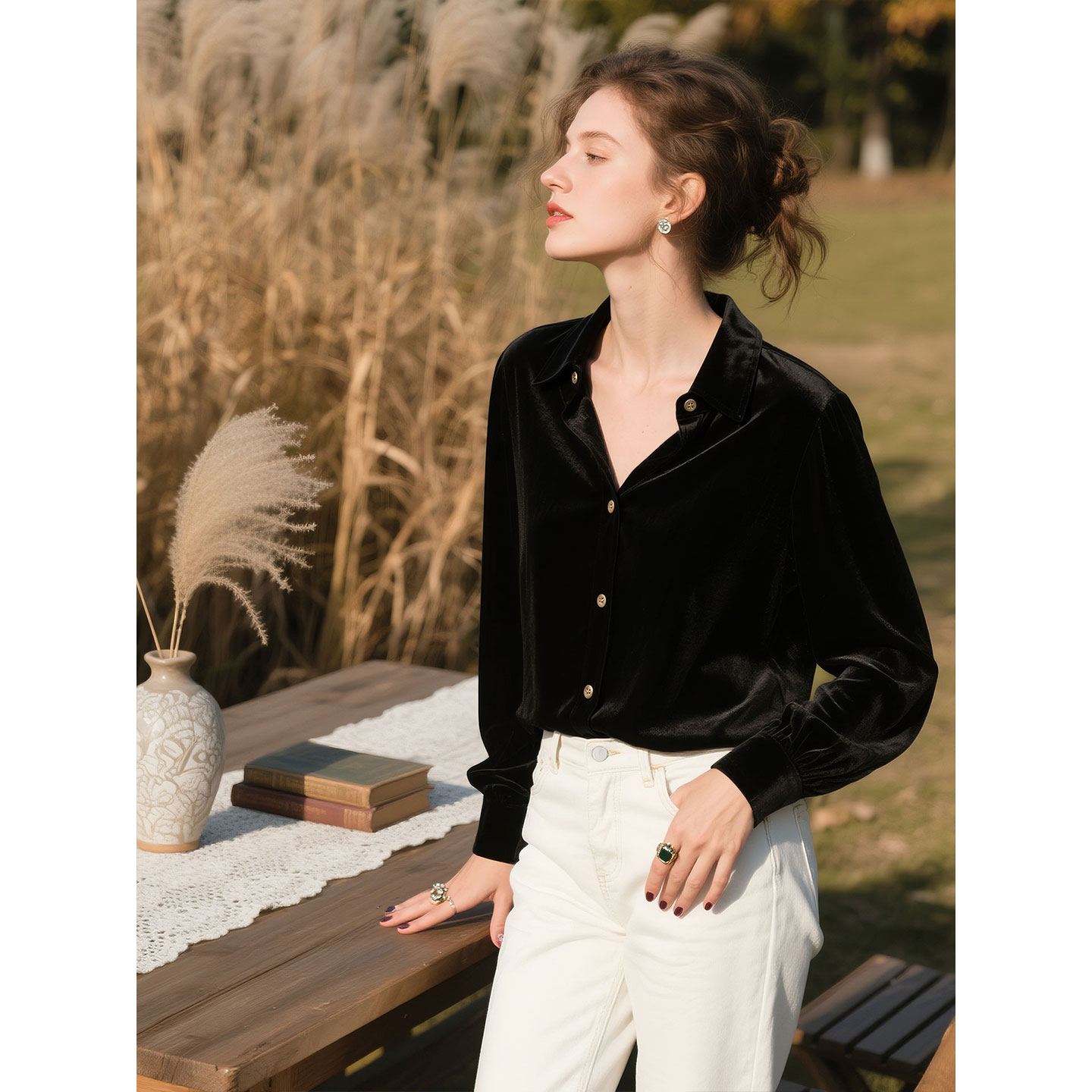 西町村屋衬衫女冬新款复古丝绒压褶基础简约款长袖衬衣AD8103009