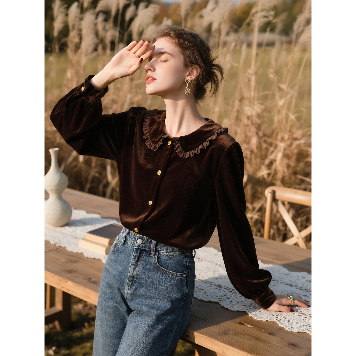 棕色丝绒立领衬衫女2025年秋冬新款木耳边复古气质显瘦长袖上衣