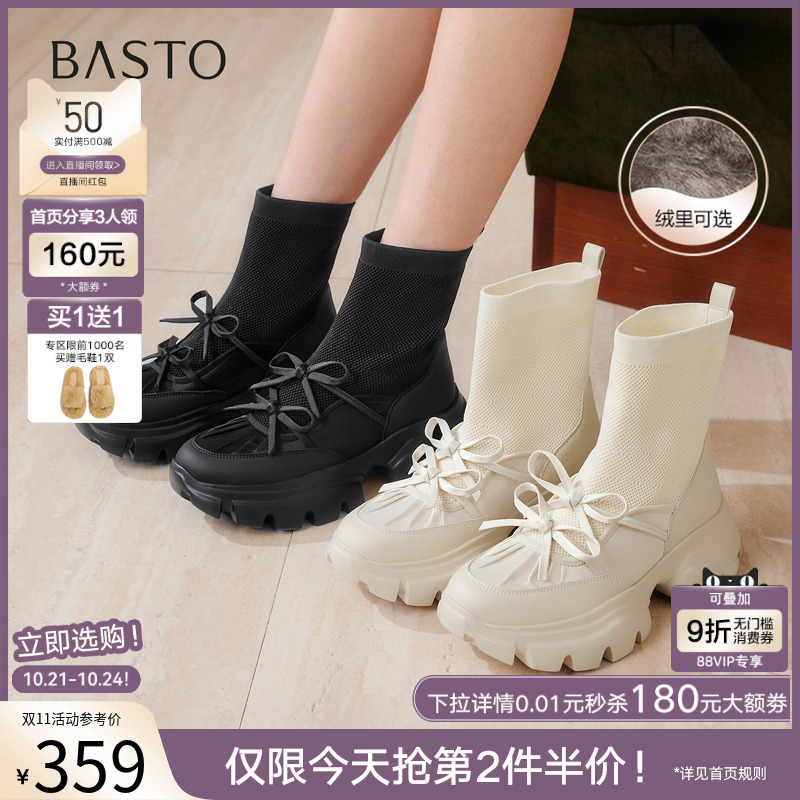百思图2025冬新款厚底白色老爹袜靴加绒弹力靴女显瘦短靴UYP01DD5