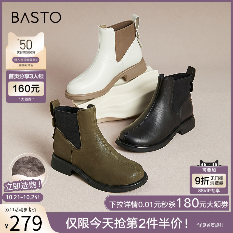 百思图冬商场同款法式及踝小白靴瘦瘦牛皮靴加绒女短靴TQ441DD3
