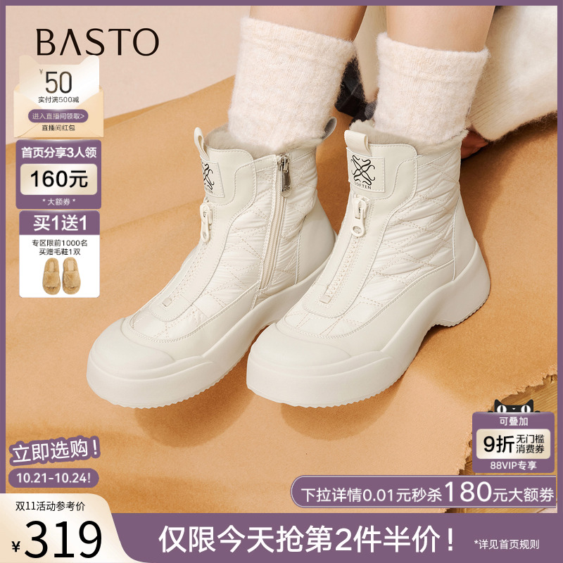 百思图2025冬季新款厚底雪地靴保暖东北大棉鞋女白色短靴W3711DD5