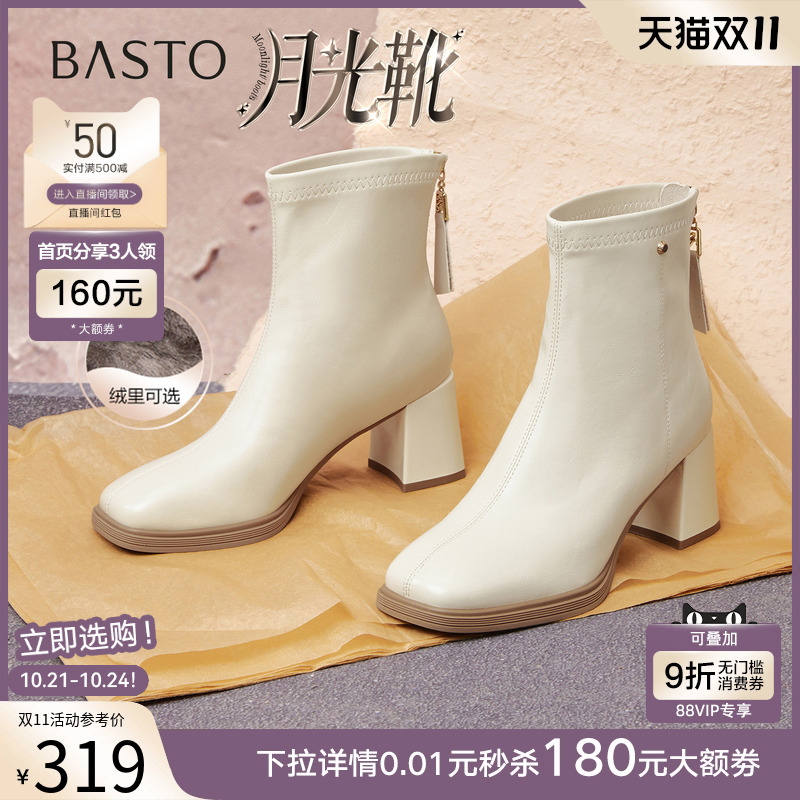 【月光靴】百思图25冬商场新款高跟白色短靴加绒法式瘦瘦小踝靴女