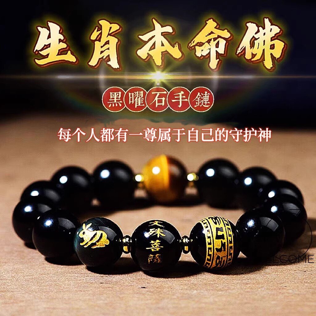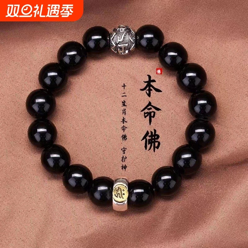 天然黑曜石十二生肖守护神手链男女款本命年转运佛珠手串情侣首饰