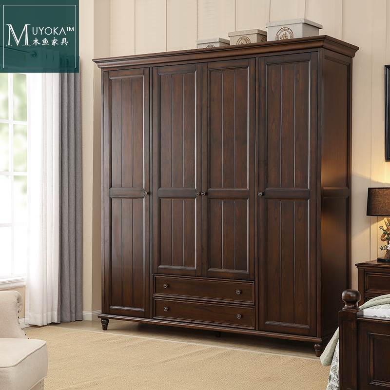 木鱼家具纯原木美式复古风全实木衣柜四门4门大衣柜衣橱卧室婚房