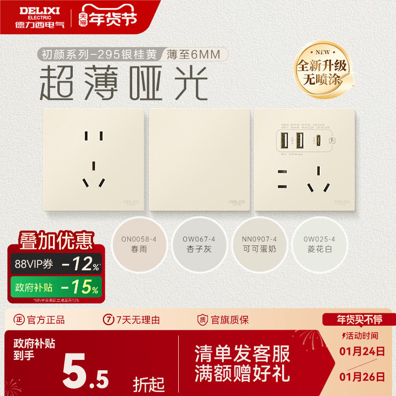 德力西官方旗舰店295超薄开关插座哑光五孔面板16A奶油风银桂黄