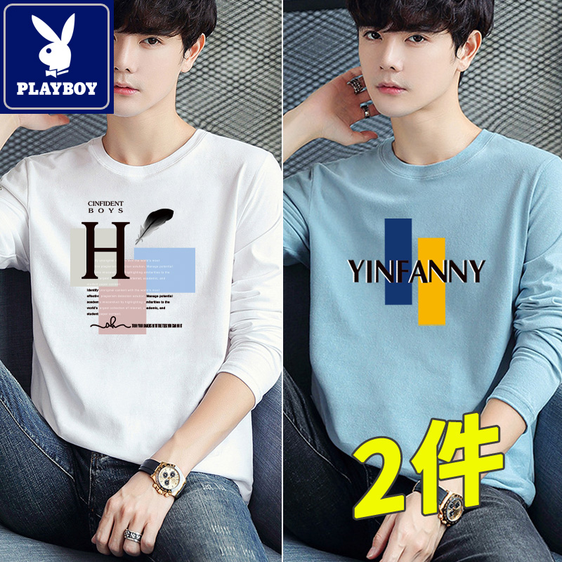 2件】花花公子纯棉长袖t恤男士青少年潮流上衣宽松全棉秋冬打底衫