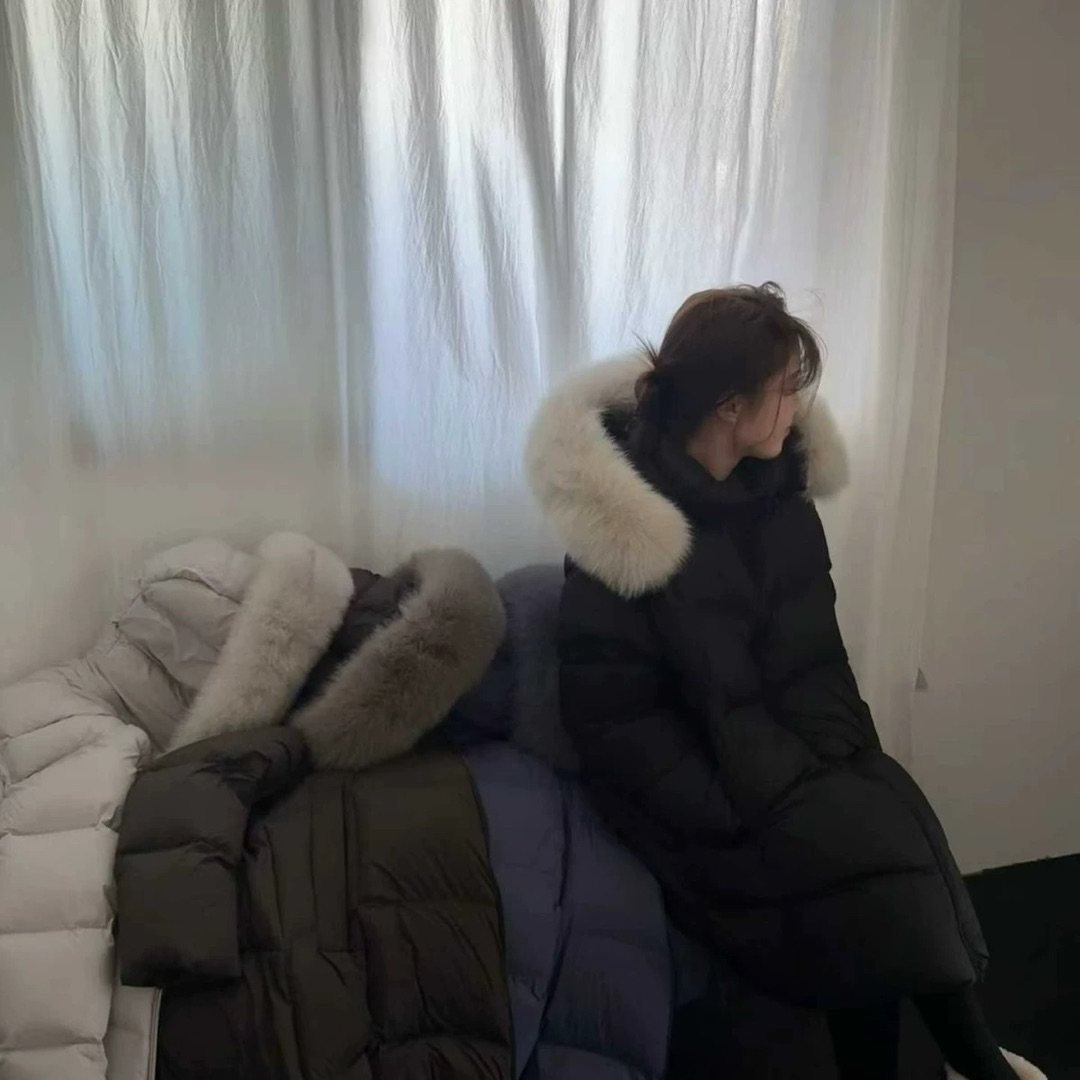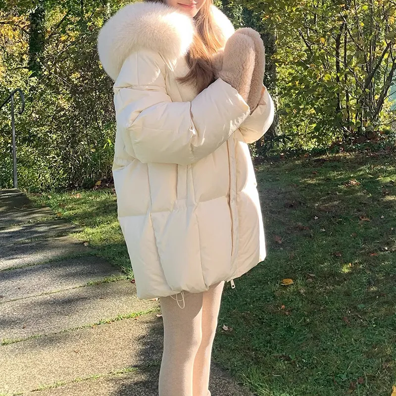 连帽云朵泡芙狐狸大毛领羽绒服中长款宽松保暖外套90白鸭绒厚款