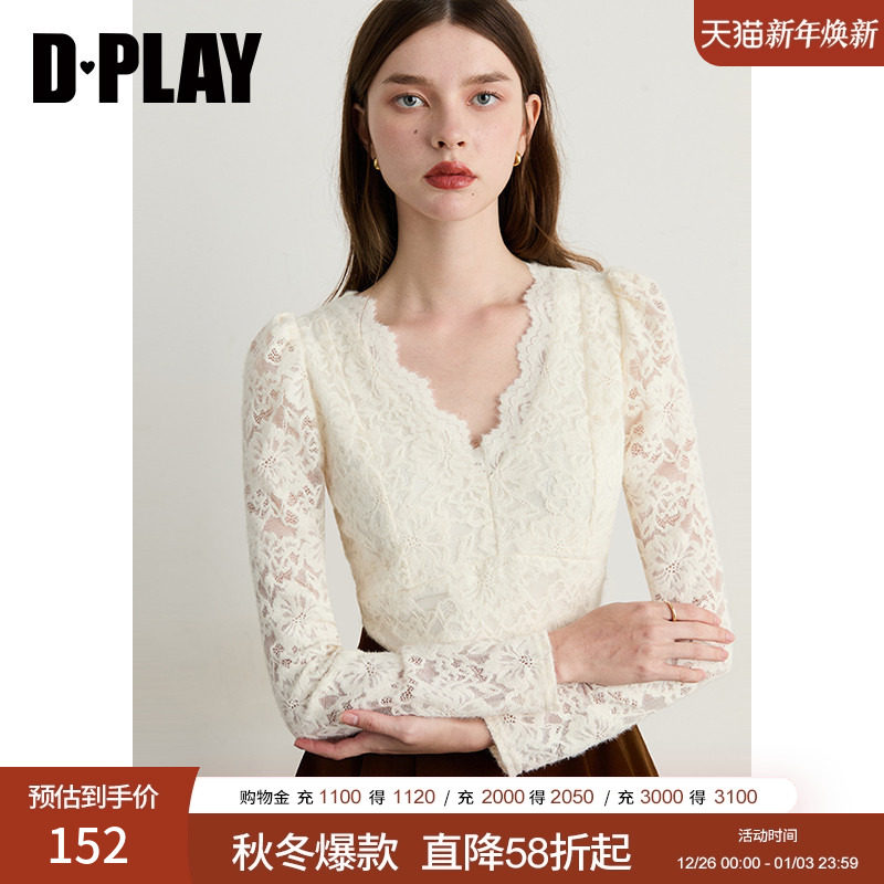 DPLAY【惠品】2025年秋白色V领植绒蕾丝花边时尚小衫上衣女