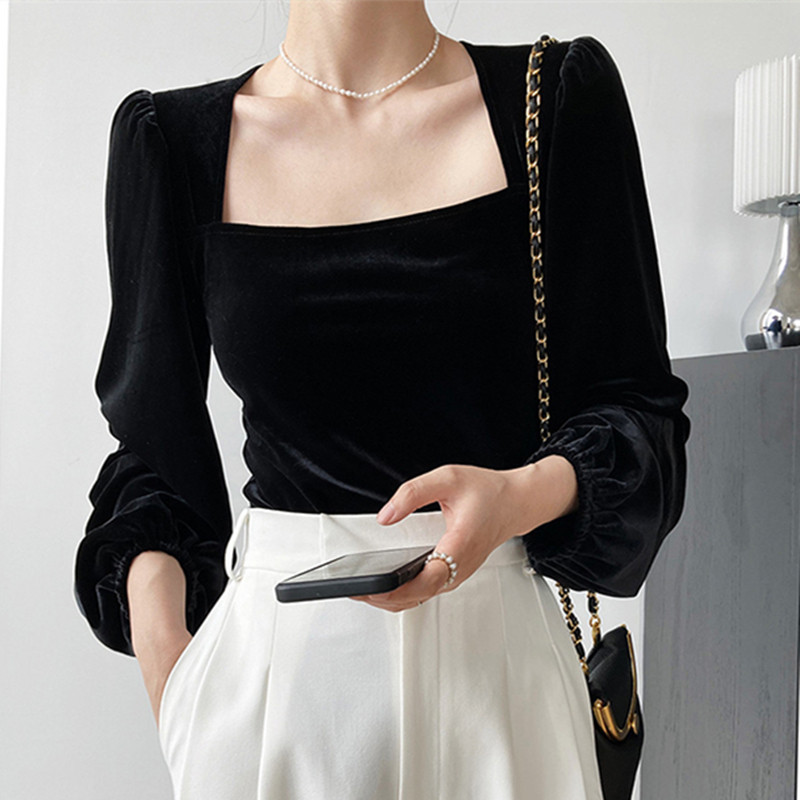 黑色收腰金丝绒上衣高级感2025春装新款气质显瘦修身减龄时尚小衫