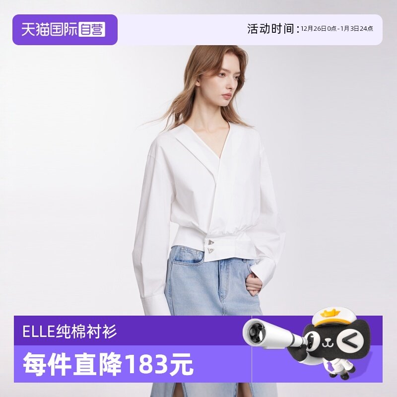 【自营】【浅春白茶】ELLE纯棉V领收腰衬衫女2025春新款时尚小衫