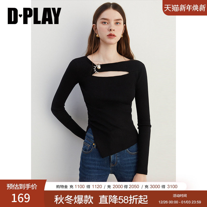 DPLAY2025秋季新款黑色毛衣女镂空修身针织衫时尚小衫上衣打底衫