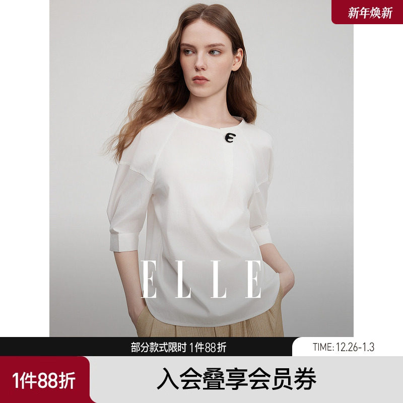 ELLE白色优雅宽松五分袖圆领衬衣女2025夏季新款通勤简约时尚小衫