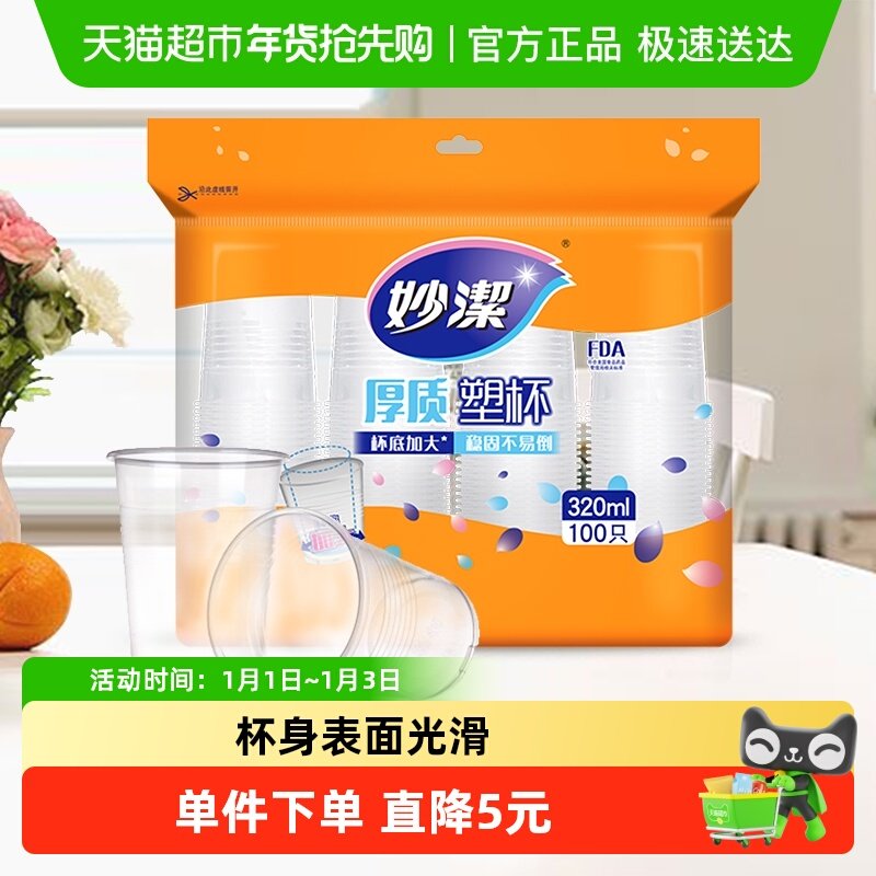 妙洁塑料杯一次性杯子家用中大号口杯透明水杯加厚办公航空食品级