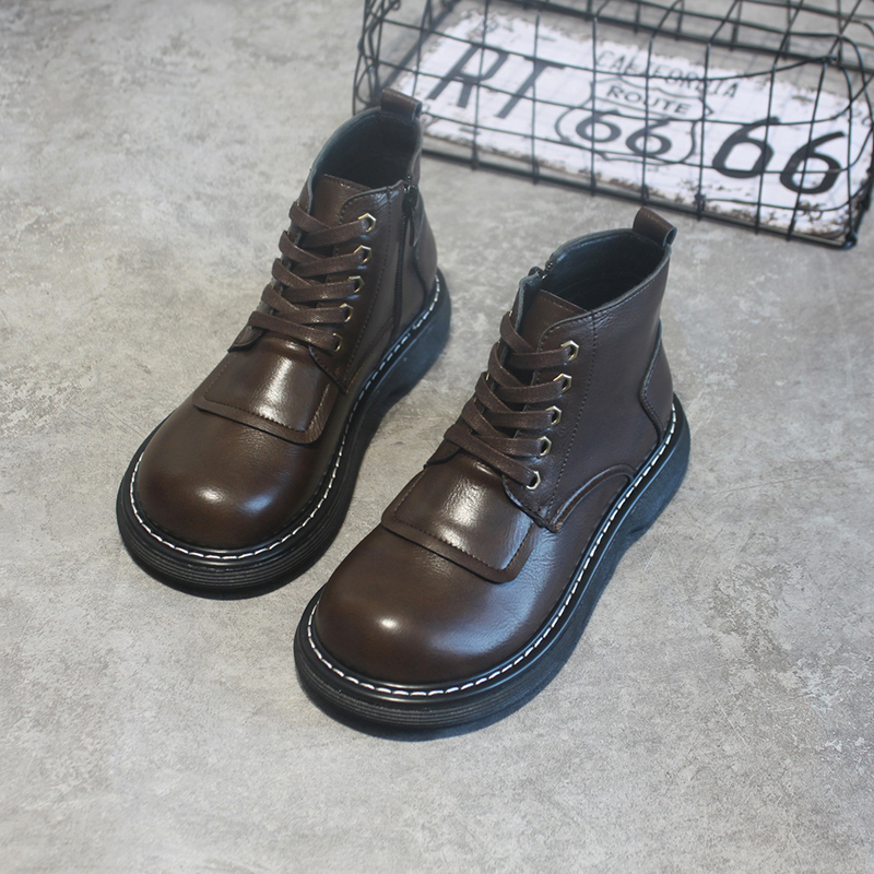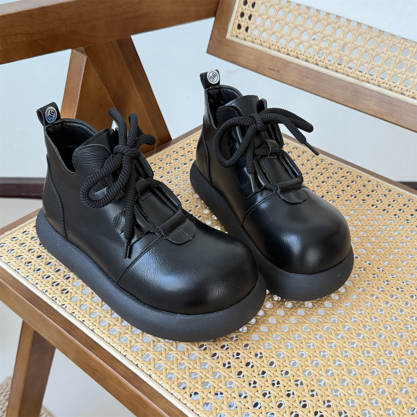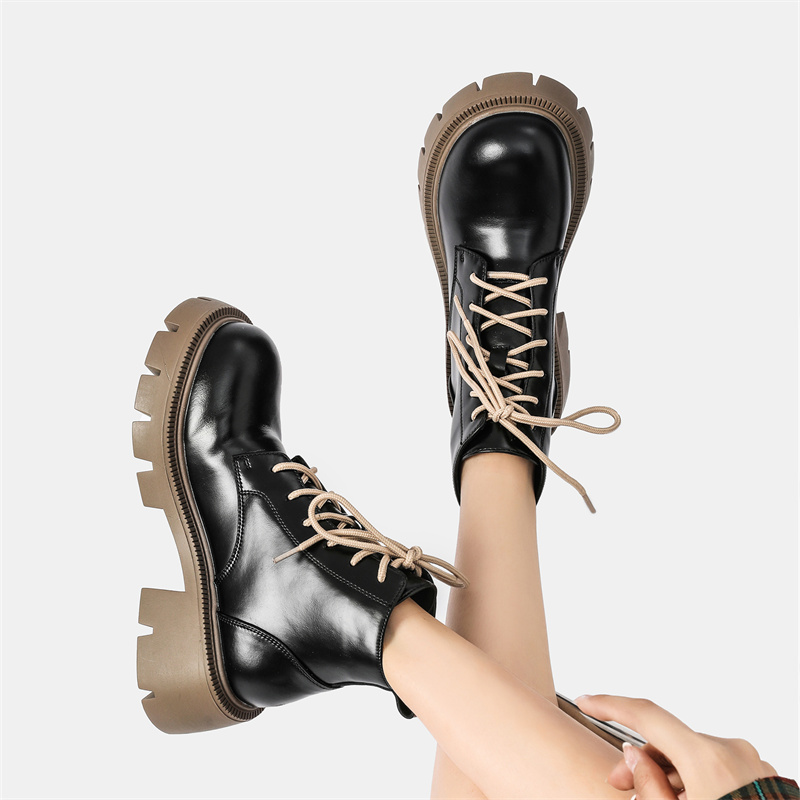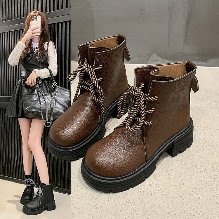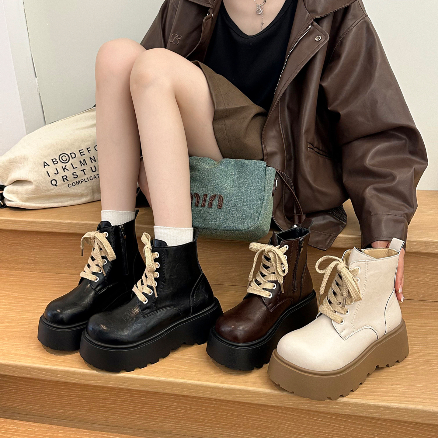 厚底圆头马丁靴女2025年秋冬新款学院风系带皮靴软底显高显瘦短靴
