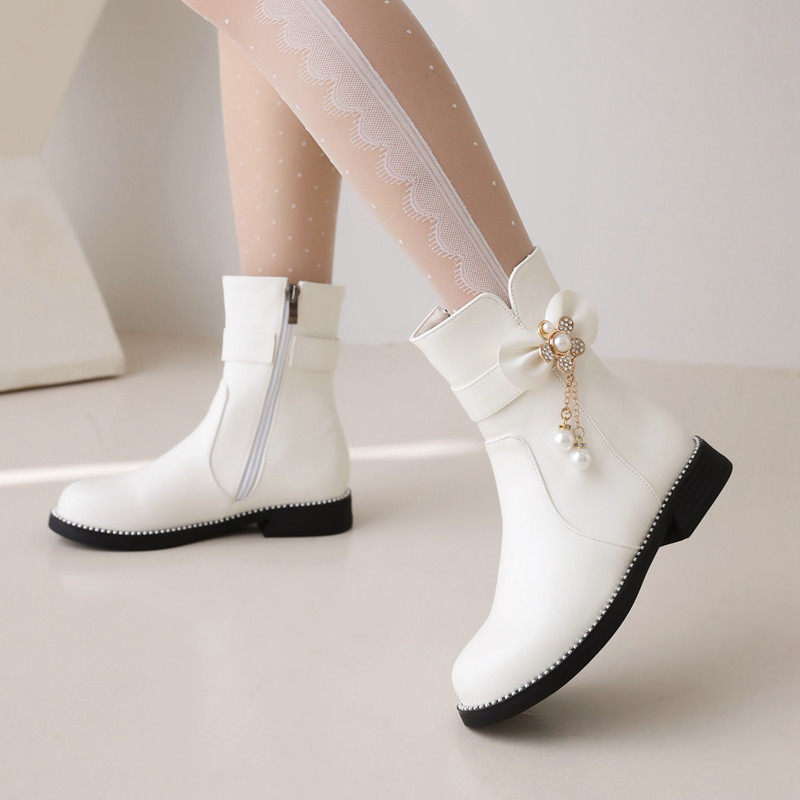 甜美学院风小码短靴子低跟圆头蝴蝶结女鞋白色百搭秋冬新款马丁靴