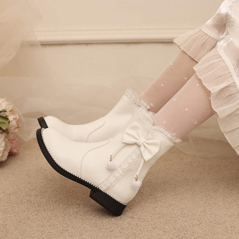 甜美蕾丝蝴蝶结低跟女鞋时尚学院风圆头短靴子秋冬大童小码马丁靴