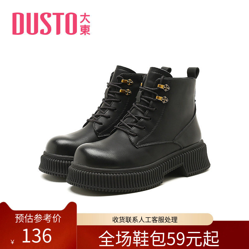 大东官方马丁靴女鞋冬季学院风中跟粗跟短靴圆头侧拉链鞋1612